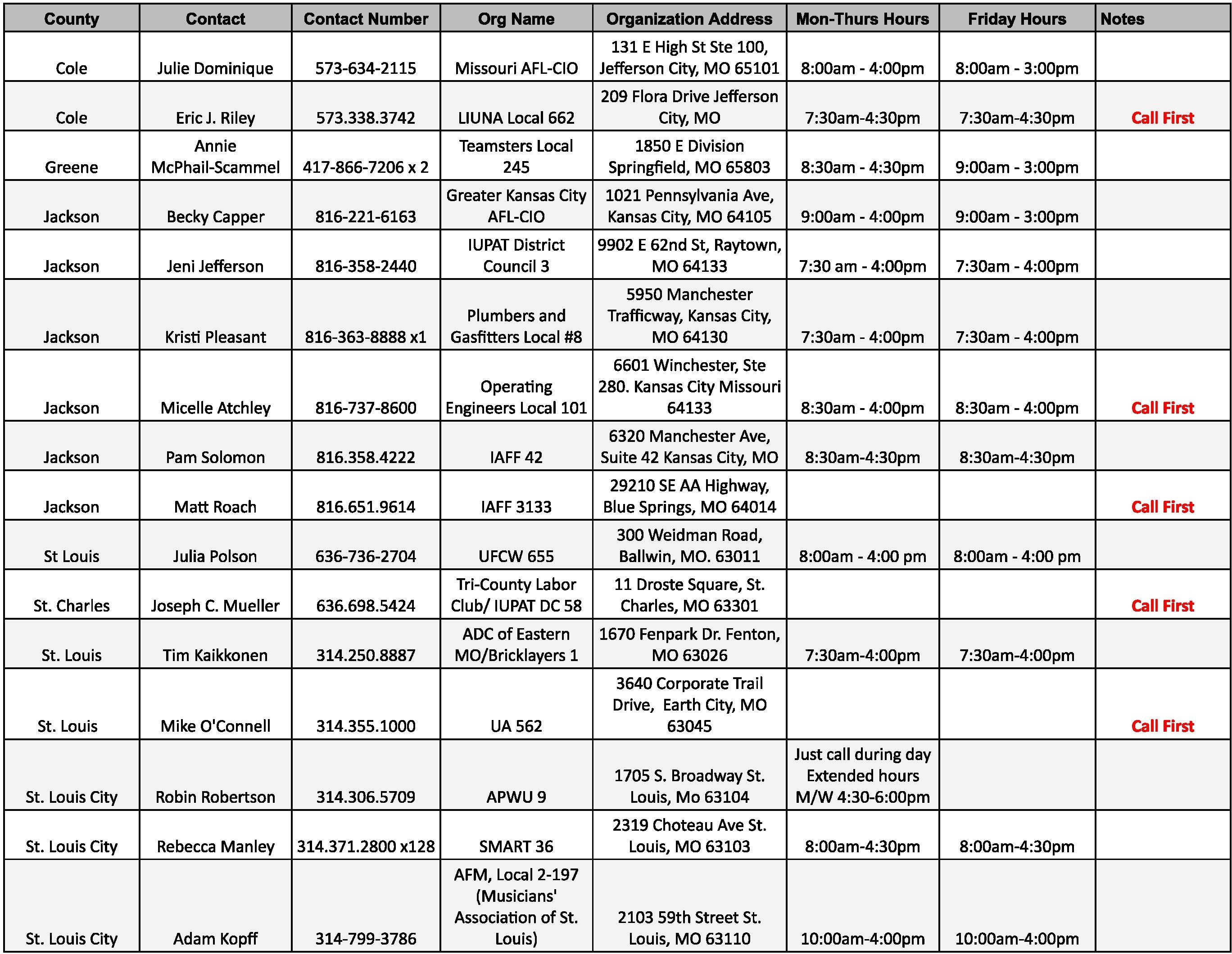 | St. Louis Labor Council 3301 Hollenberg Drive, Bridgeton M/W/F 9:00am-4:00pm Extended office hours Tuesdays and Thursdays till 7 | Greater Kansas City AFL-CIO 1021 Pennsylvania Ave, Kansas City M/W/F 9:00am-4:00pm or by appointment | Missouri AFL-CIO 131 E. High Street, Suite 100 Jefferson City M/W/F 9:00am-4:00pm or by appointment |